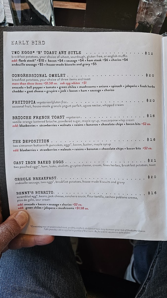 two poached eggs*, ham, leeks, shallots, gruyère cheese, cream, fines herbes, breakfast potatoes, toast