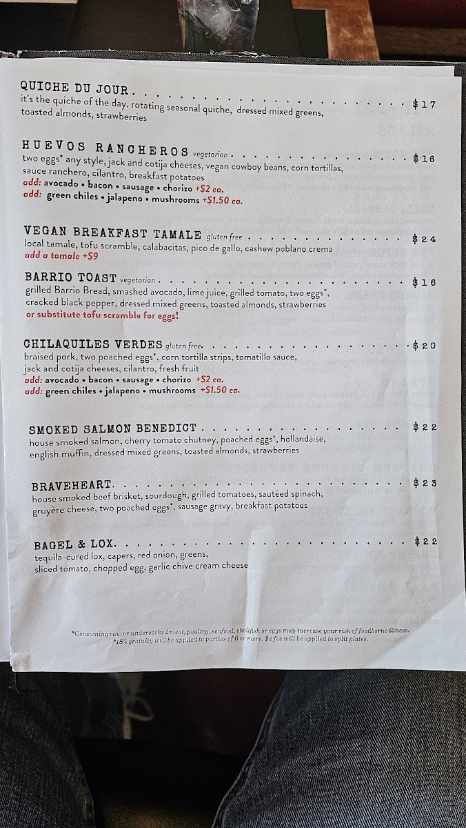 two eggs* any style, asadero and cotija cheeses, vegan cowboy beans, corn tortillas, sauce ranchero, cilantro, breakfast potatoes vegetarian