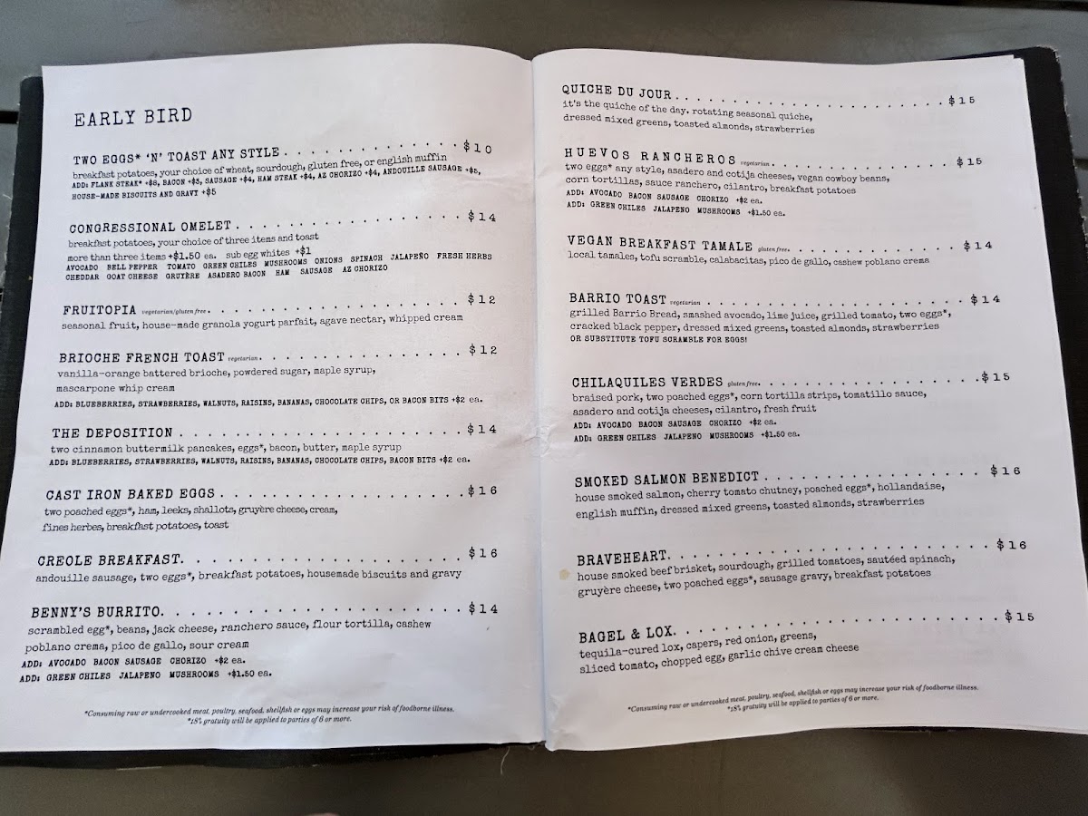 smoked beef brisket, sourdough, grilled tomatoes, sautéed spinach, gruyère cheese, two poached eggs*, sausage gravy, breakfast potatoes
