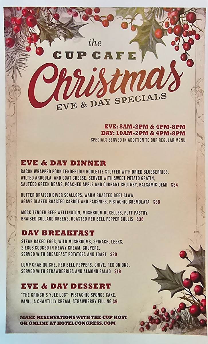 Cup Cafe, nestled in the heart of Tucson at 311 E Congress St, is a charming haven for food lovers. This cafe offers a diverse menu that pleases both sweet and savory enthusiasts. Their dessert selection is a highlight, featuring decadent options like the rich Bailey's Mocha Mousse Cake and the tangy Lemon Meringue Pie, each priced at $8.50. For those craving something casual, the Brown Butter Heath Chocolate Chip Cookie and Strawberry White Chocolate Chip Oatmeal Cookies are irresistible at just $3.00.